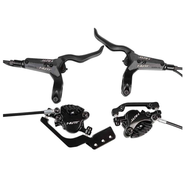 Das NUTT Hydraulikbremsset besteht aus Bremshebel rechts / link sowie Bremssattel vorne und hinten vollständig mit Bremsbeläge.