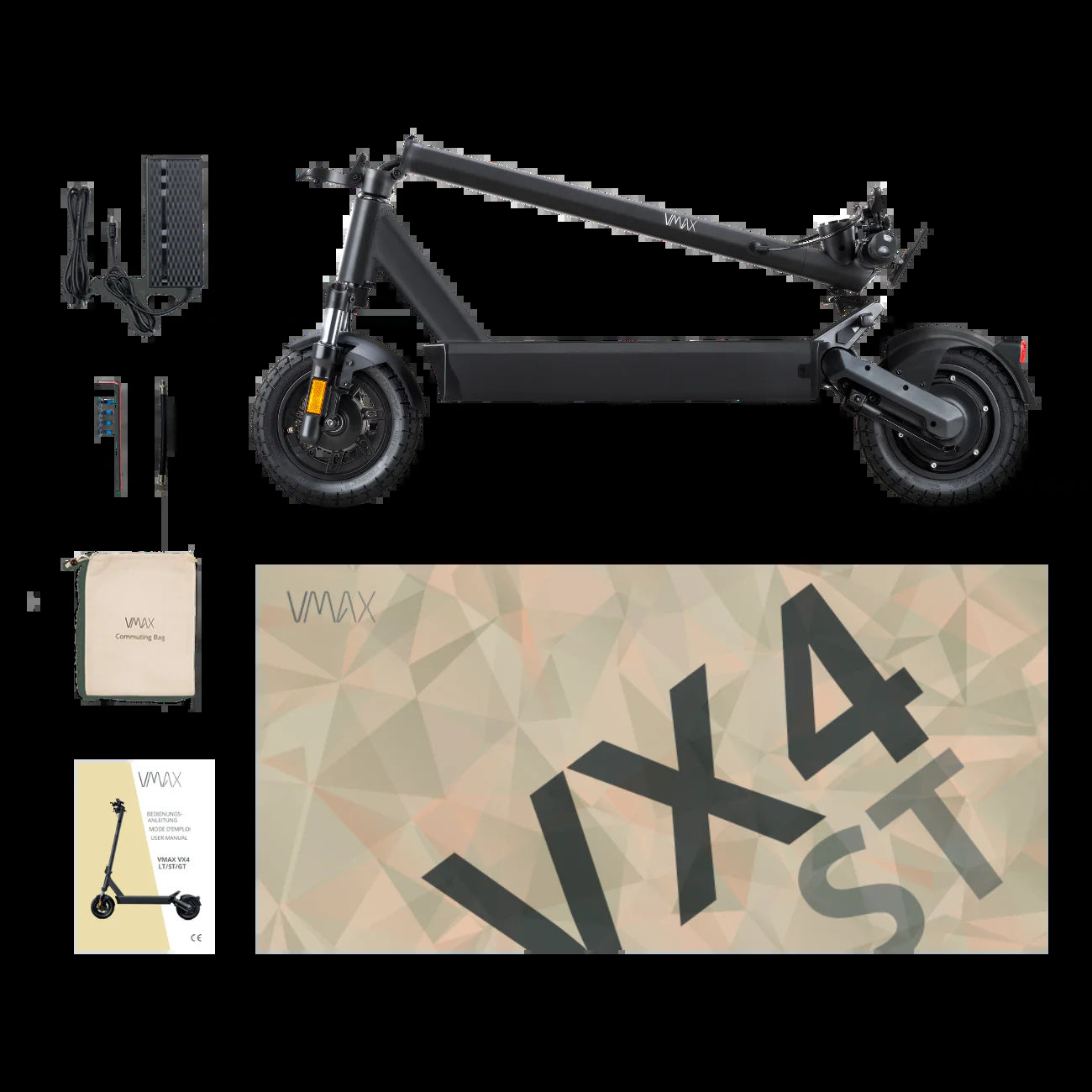 1x VMAX VX4 STHeiße das neue Flagschiff der VMAX-Produktfamilie willkommen! Der brandneue VMAX VX4 vereint alle bisher entwickelten Technologien und ist ein absoluter Vorreiter in Sachen Innovation, Leistung, Fahrkomfort und Technik. Seine Doppelfederung vorn und hinten macht ihn zum idealen Wegbegleiter für jedes Terrain und der enorm starke Motor mit einer Peakpower von 1.600W katapultiert den Fahrer regelrecht Steigungen von bis zu 30% nach oben. Mit einer Reichweite von bis zu 100km sorgt der große Akku zudem dafür, dass der VX4 selbst bei einem 'long-distance-ride' nicht die Puste ausgeht.